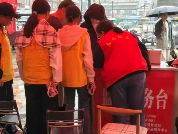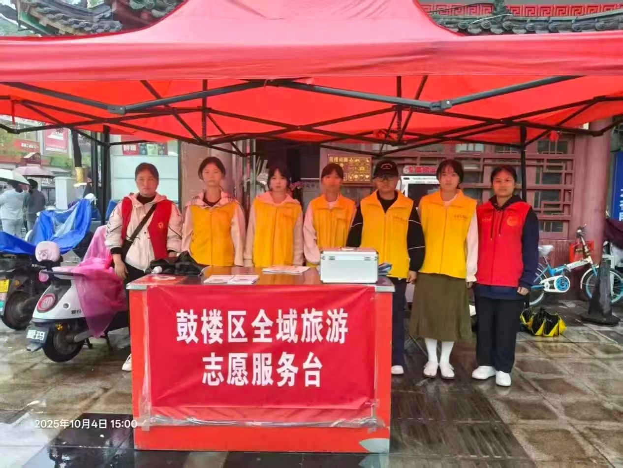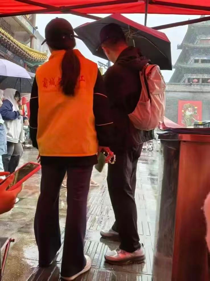 活动开始后,志愿者们迅速进入服务状态。雨水打湿衣袖,却未浇灭大家的服务热情:在鼓楼广场主区域,他们耐心为游客指引游览路线,细致解答景点位置、交通换乘等疑问;在历史文化街区,同学们提前梳理鼓楼历史脉络与古城文化故事,以略显稚嫩却格外认真的讲解,让文化传承更具温度;针对雨天街区人流密集、路面湿滑的情况,志愿者们还主动协助工作人员维护现场秩序,反复提醒游客注意脚下安全,贴心举动收获过往市民与游客的连连称赞。